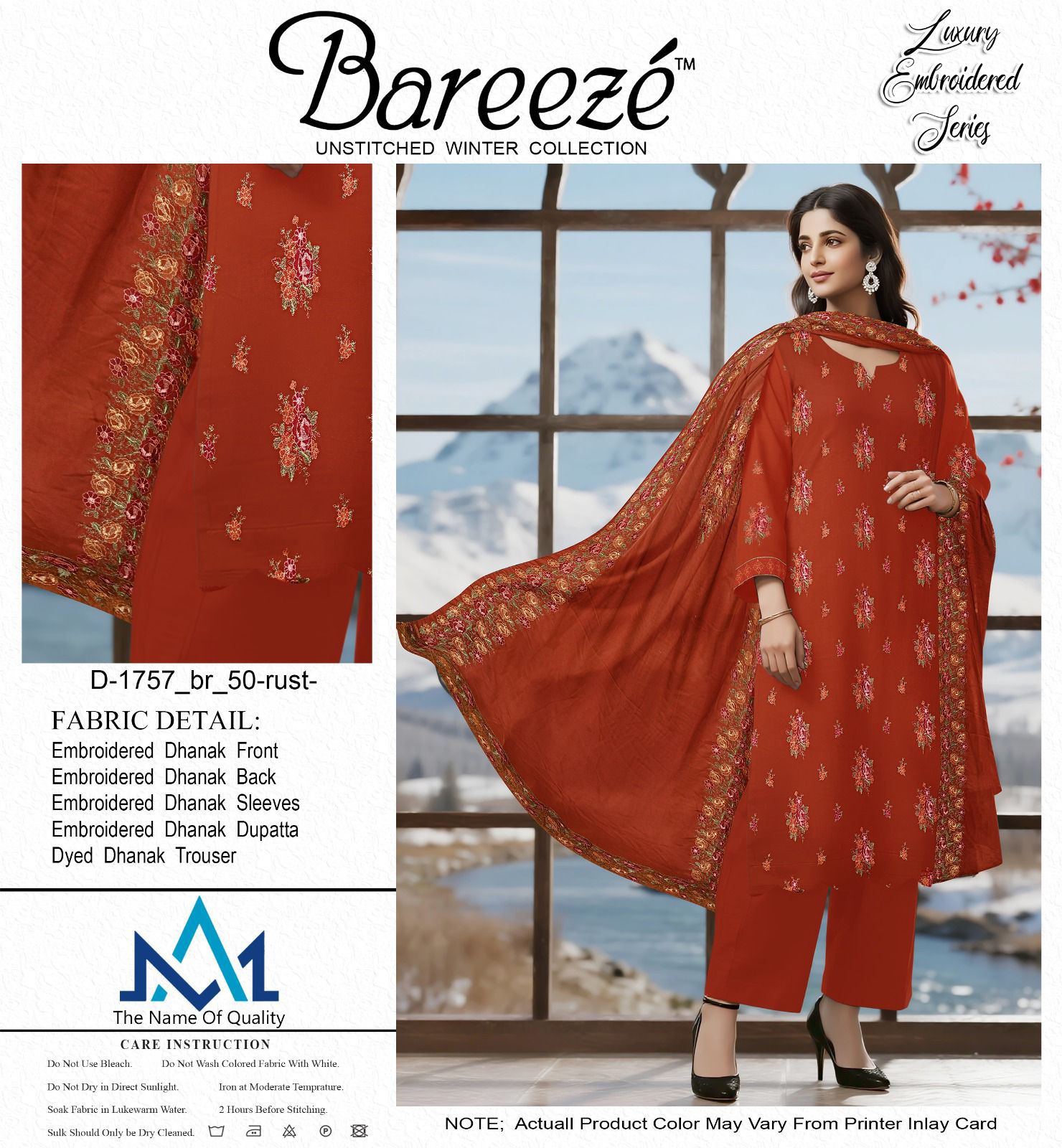 Bareeze Luxury Dhanak 3-Piece — Auburn Embroidered Winter Suit Experience sophisticated winter elegance with this exquisite Bareeze ensemble in rich auburn tones. Ideal for discerning women seeking luxury winter wear that balances traditional artistry with modern comfort and style.
